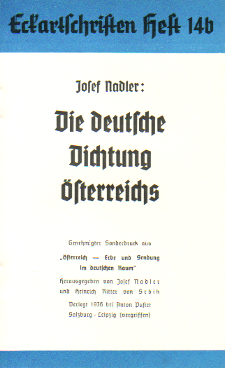 Eckartschrift 14b: Die deutsche Dichtung Österreichs 12. September 200916. Februar 2020Kallinger Josef Nadler. Die deutsche Dichtung Österreichs. Eckartschrift 14b.